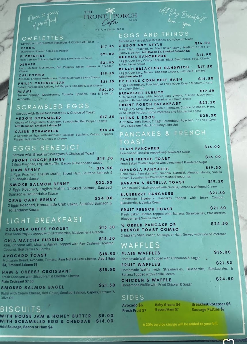 When you step into Front Porch Cafe, you’re not just enjoying a meal; you're embracing the essence of South Beach with every plate and sip. Whether you’re indulging in decadent pancakes or a rich veggie omelette, the dishes here are crafted to ensure satisfaction and leave you wanting more. Come and discover for yourself why Front Porch Cafe has become a highlight of Ocean Drive, where every visit is an experience to cherish.